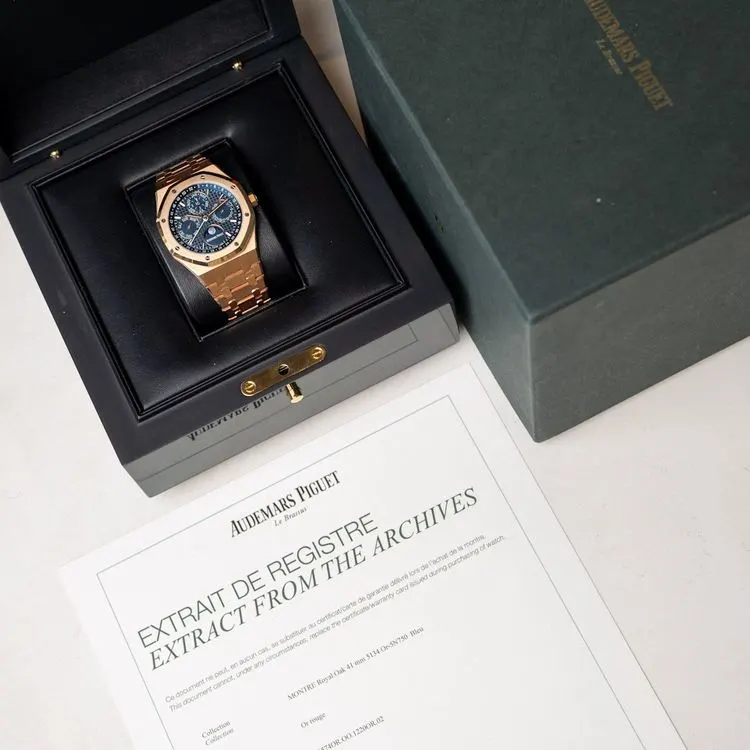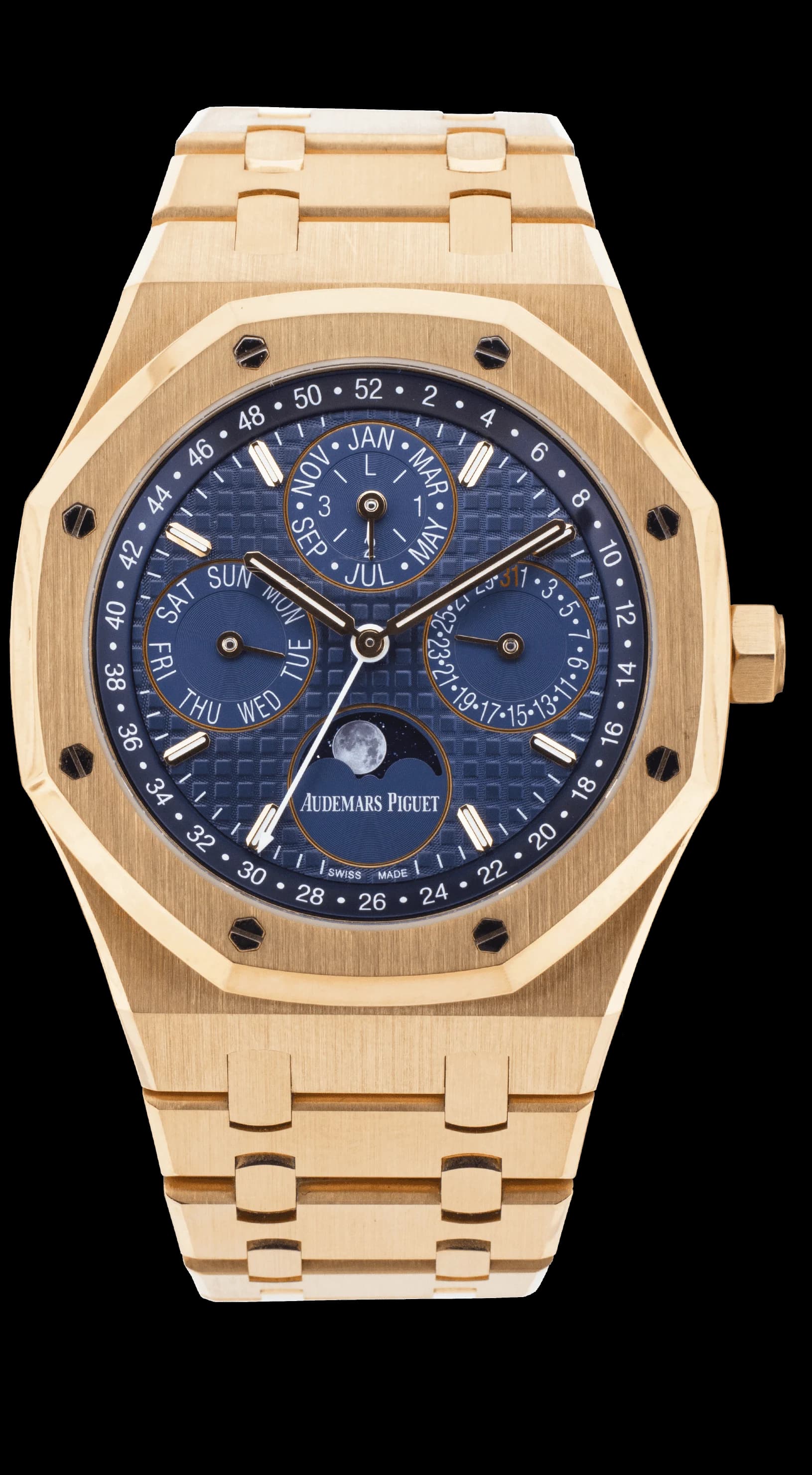 The Royal Oak model is already a mythical watch in its own right, and has been making headlines since 1972... Here we find the latest version of the Quantième Perpétuel in a 41mm rose gold case, with the introduction of a blue dial with a “Grande Tapisserie” motif giving the whole an incomparable...