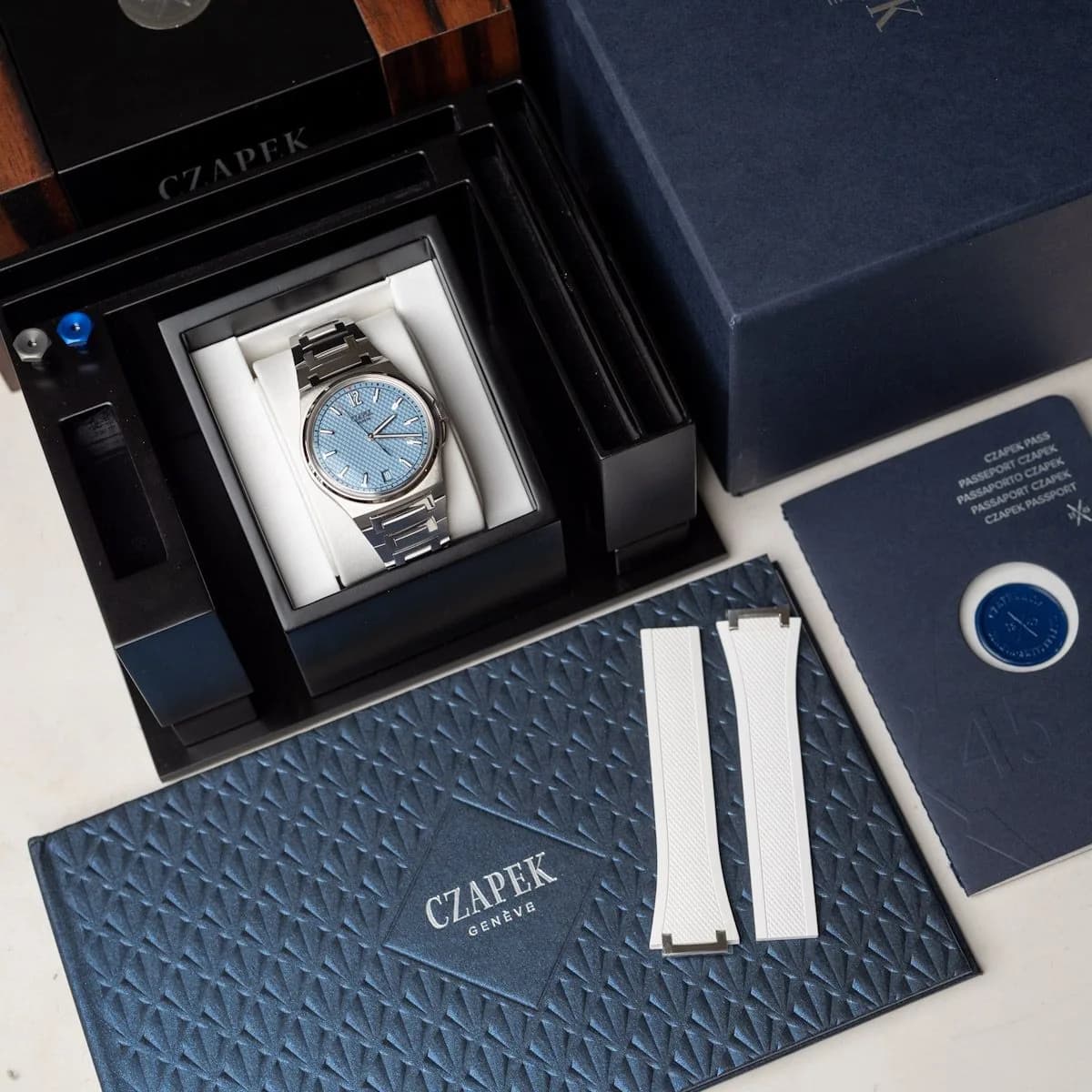 The new Antarctique Passage de Drake collection takes the sport-chic case design of the Antarctique Terre Adélie line and pairs it with an atypical trapezoid dial motif in light blue. The micro-rotor movement adding an impressive view to this stunning piece.