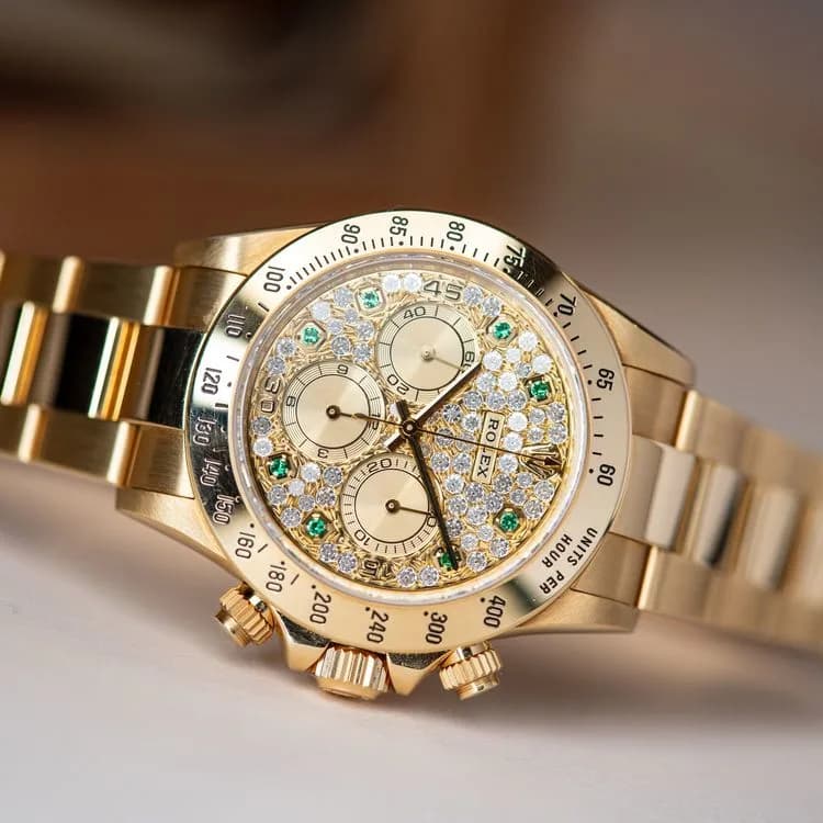 A mythical, full-gold model... The Daytona Zenith is already a piece of history, the Manufacture's first automatic chronograph with crown. This version is distinguished by its sublime dial paved with diamonds and set with 8 emeralds for the hour markers. A watch of absolute rarity and beauty... A...