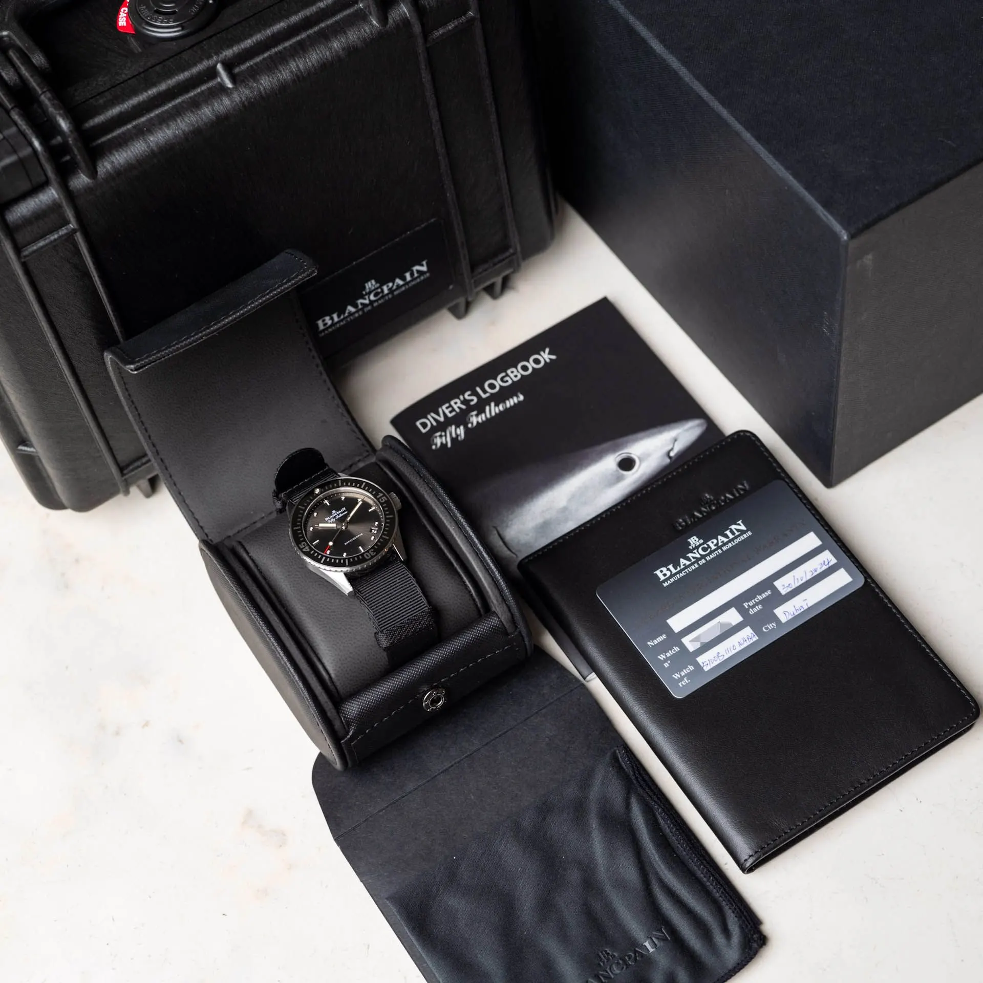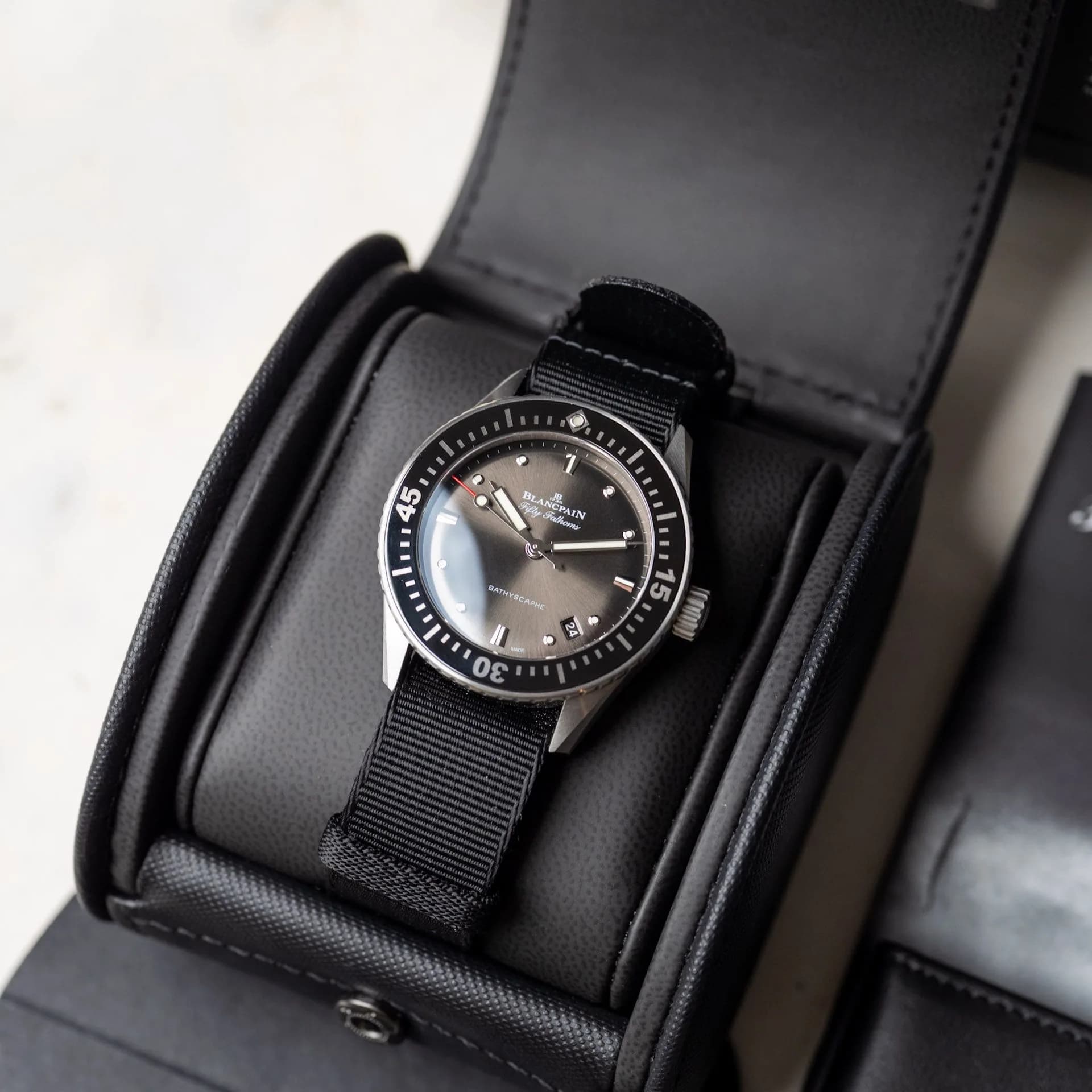 This Blancpain Fifty Fathoms Bathyscaphe is the perfect blend of technical sophistication and refinement. Its ultra-flat 38 mm case features an automatic caliber with an impressive 100-hour power reserve. The meteor-gray sunray dial offers maximum legibility in any situation. Special mention goes...